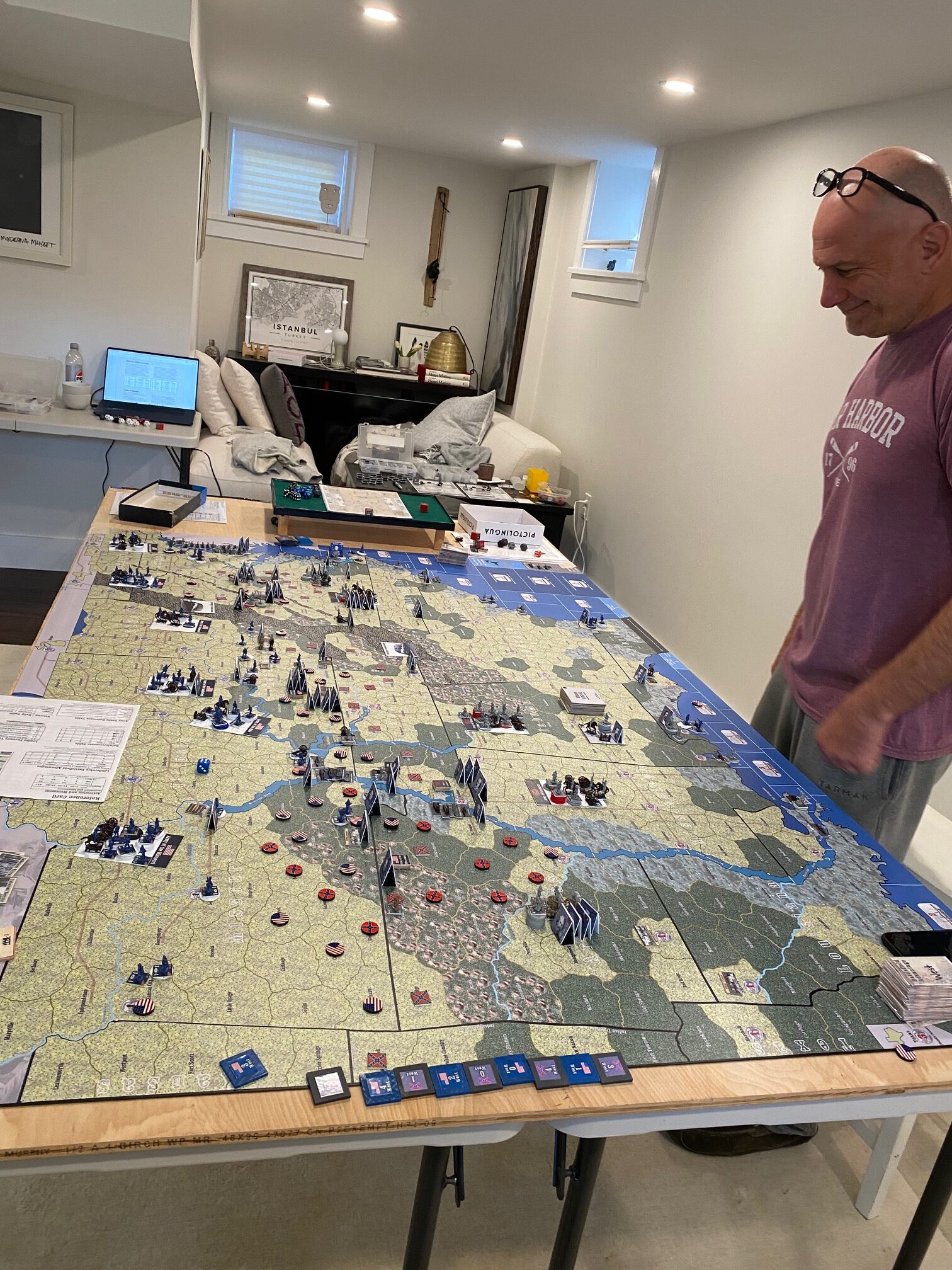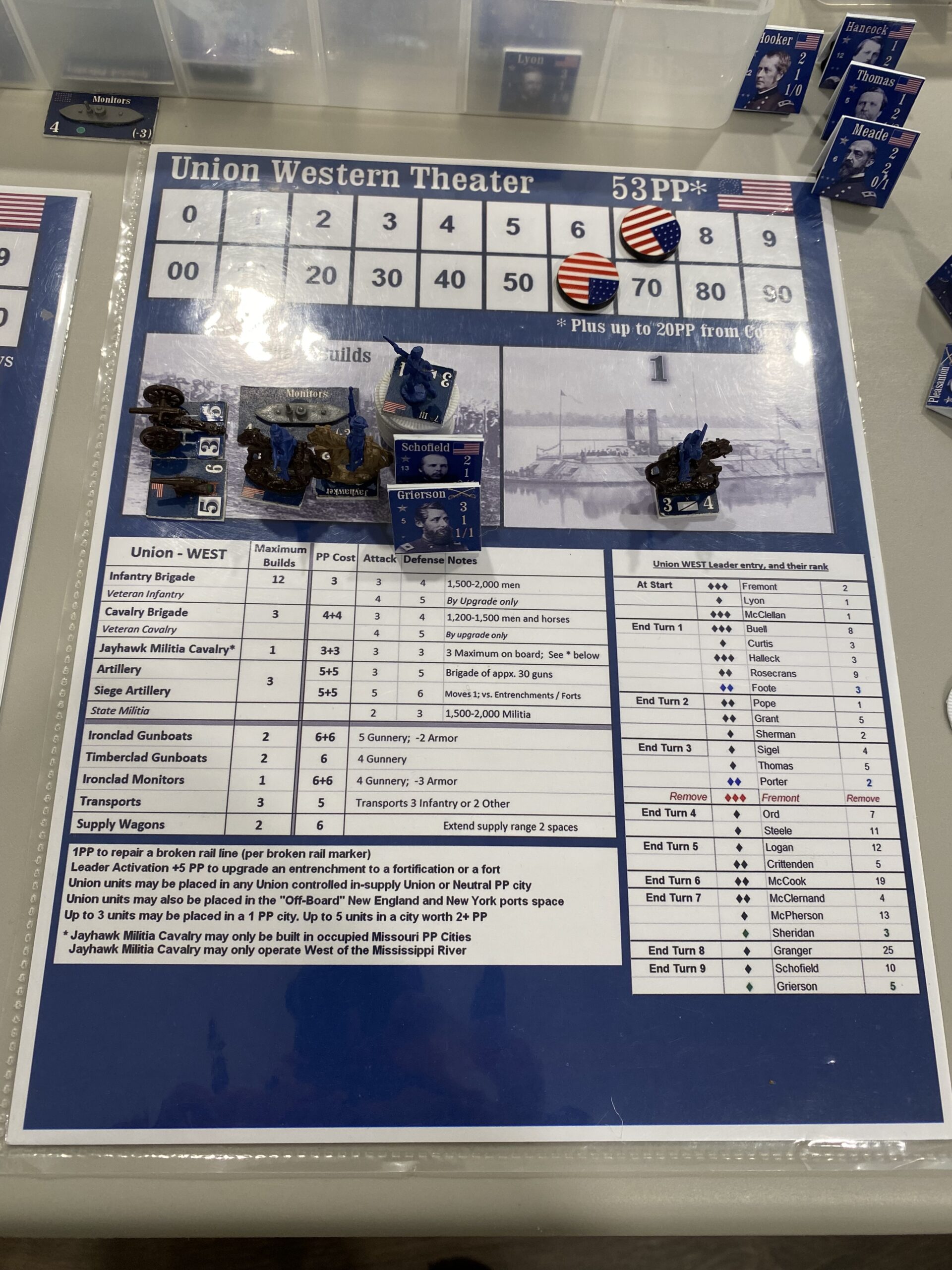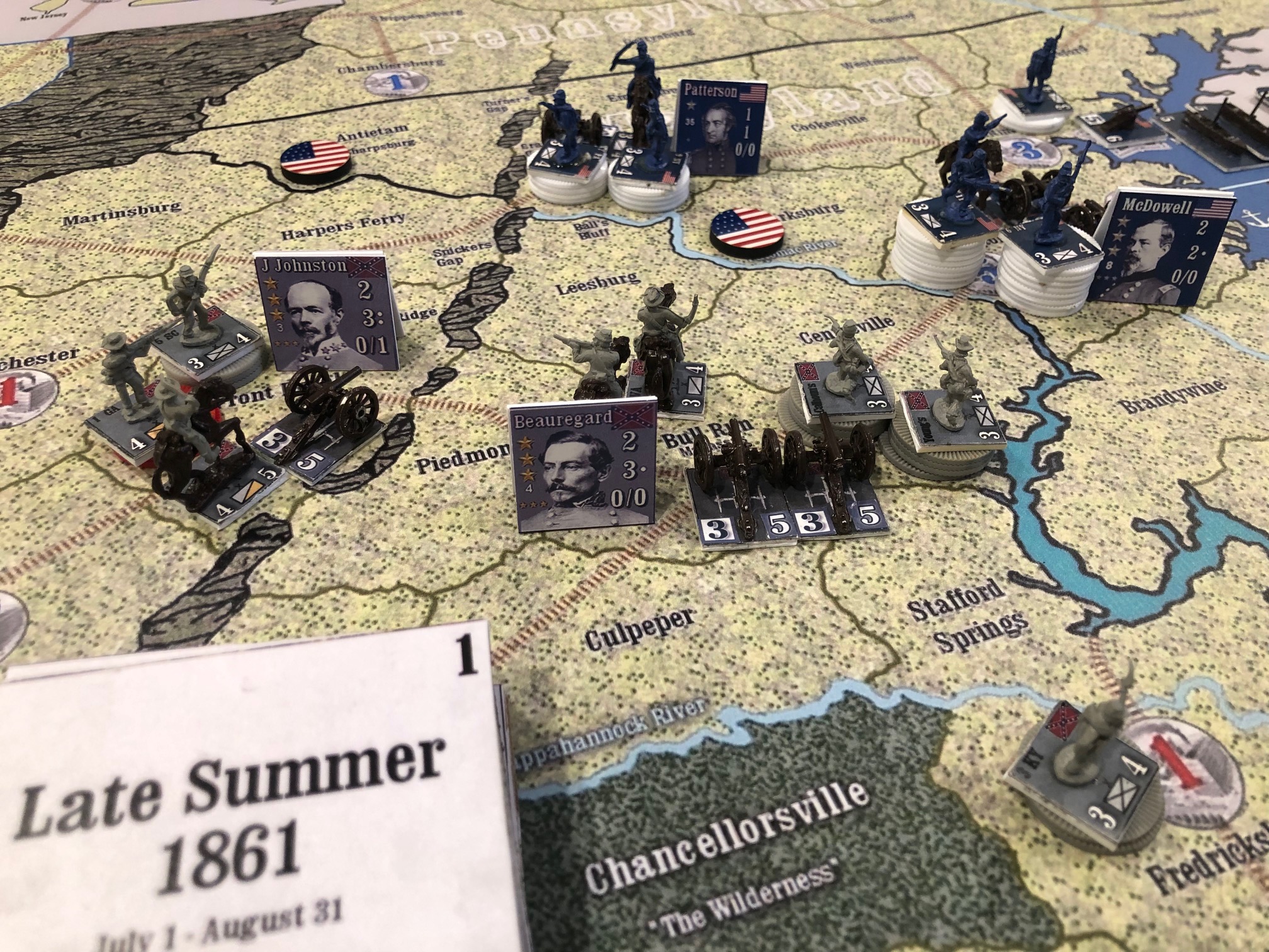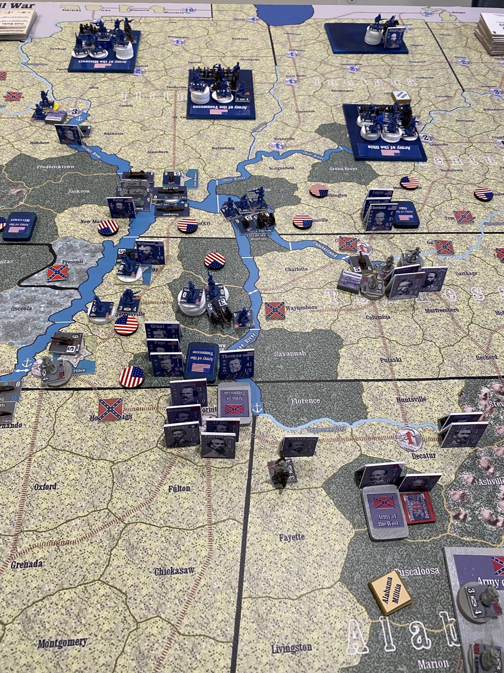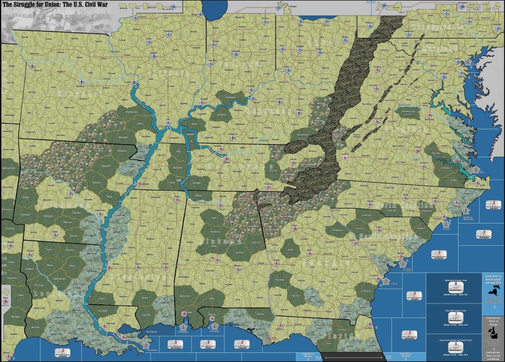 Struggle for the Union: ***Note – this game is currently under contact to be published by Compass Games***. This is a American Civil War monster game – requiring approximately 20-25 hours of playtime. This version is the result of nearly 8 years of development. This game starts in 1861 – with 4 turns per year – and features military army and naval leaders. The game follows a historical timetable putting pressure on the Union to attempt to keep up with historical progress leading up to the Presidential election of 1864. The Confederates may win by offensively performing significantly better than they did historically or may “win” by losing slower than they did historically. Combat is resolved with D12 dice – one die roll per unit. The naval, ground and fort combat resolution processes are detailed, unique and intuitive.